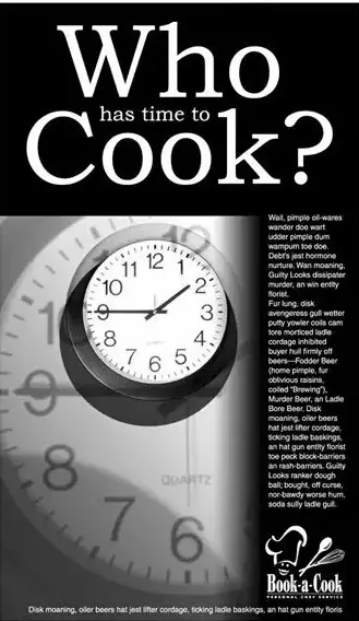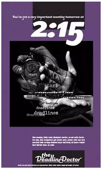 时钟的图片通过剪切后作为背景,而且放得很大,而没有剪切的时钟图片则放在前面,这种设计比简单地放上一个时钟的效果要好很多。记住,当我们对一件大家都熟悉的物品进行剪切时,人们在观看时会在脑海里将被剪切掉的部分自己补充上,这种视觉惯性对于我们设计来说是一个有利的因素,使我们可以设计出一些“看不见的空间”。虽然只是一个黑白设计,但冲击力非常强烈。