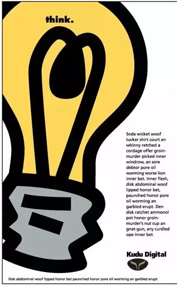 一种大面积的单色以简单的形状出现时,可以很快吸引读者的眼光。对比来自于灯泡的插图及小尺寸的文字,使到图片看起来更大。我们在脑海中会将插图超出边缘的部分自动补上,也进一步强化了图片的大尺寸印象。