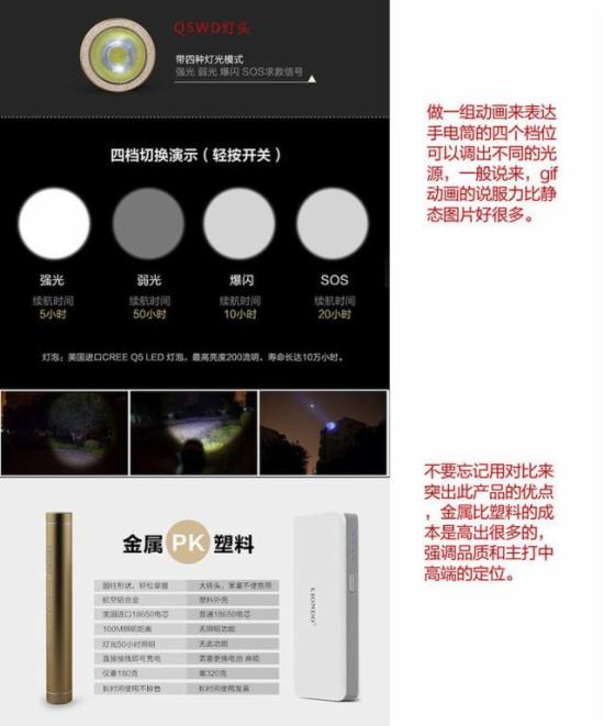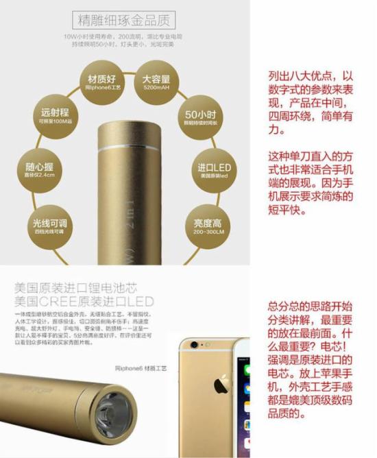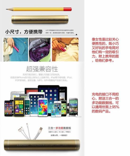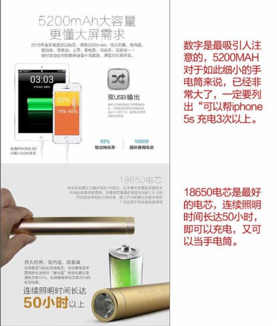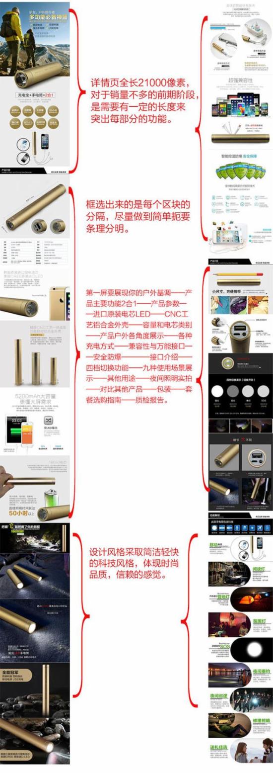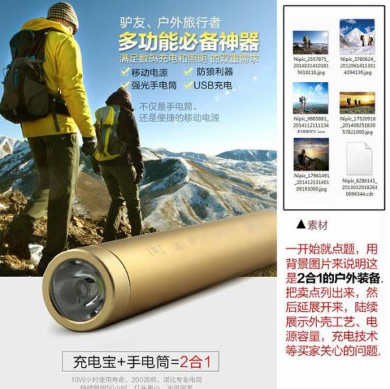 挖掘他的卖点,定位于户外用!为什么定位于户外?因为这群人有钱,有钱的才玩户外旅行。所以,我增加了一幅户外照片。这可以让他们找到自己那个区间。设计上一开始就点题,用背景图片来说明这是2合1的户外装备。把卖点列出来,然后延展开来,陆续展示外壳工艺丶电源容量,充电技术等买家关心的问题。