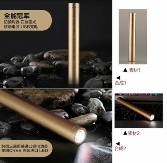 那么此时消费者关心2合1是否能达到需求?即电源的电量是多少?手电筒的效果如何?便携度如何?产品拍摄上面有硬伤,只能通过后期的PS来营造户外的氛围,比方说利用天然石块的背景来体现产品的金属质感丶户外特性。