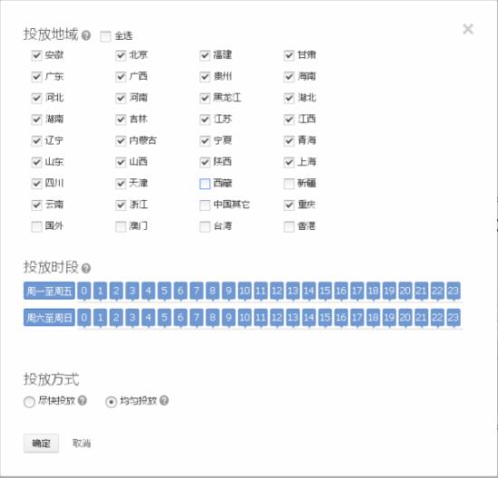 刚开始投放的时候没什么思路,也没什么策略,就是建了一个投放范围很广的一个计划投放,时间段是全天侯投放,投放地域也是非常的广泛。